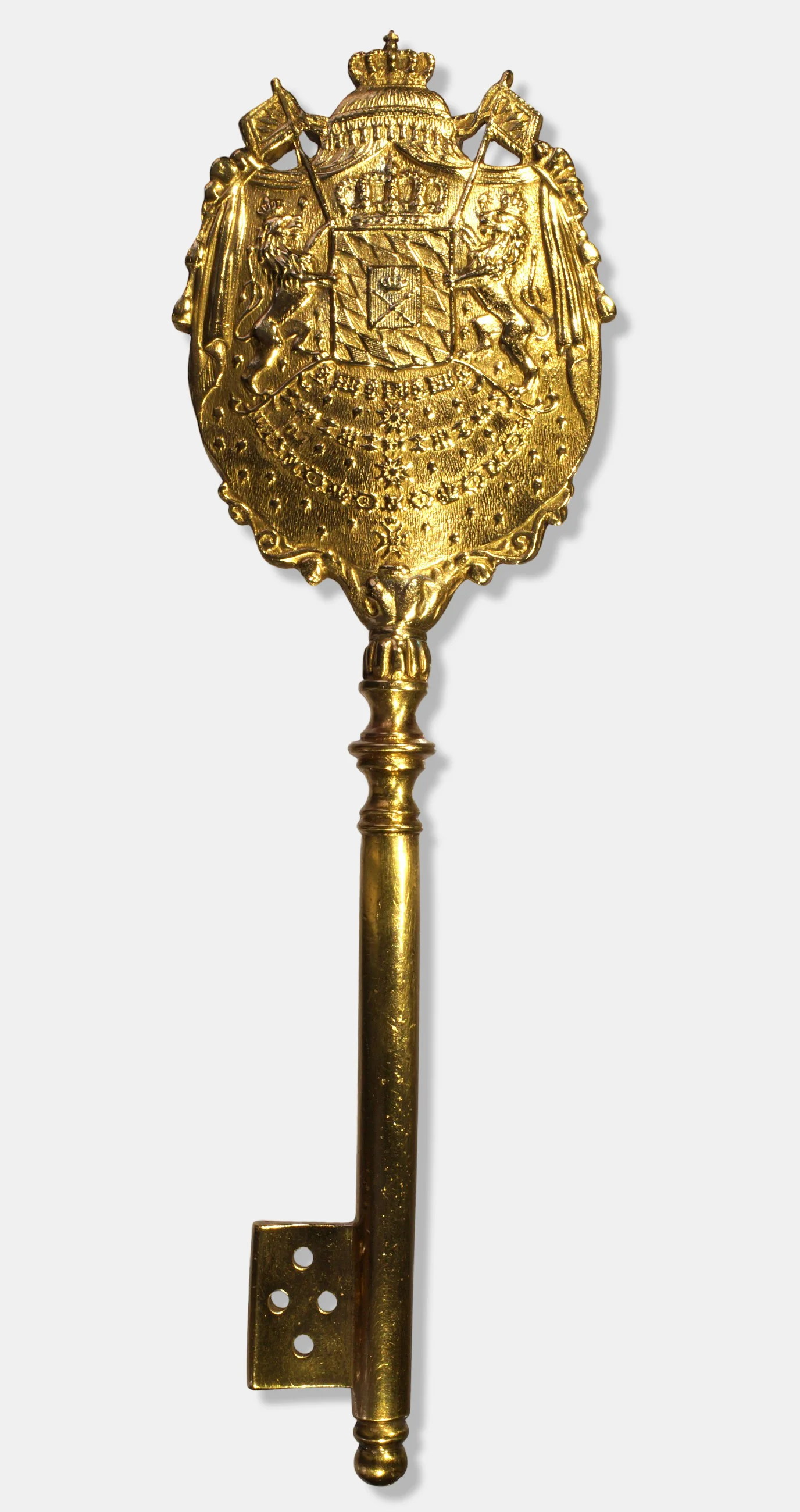 Nur allein auf das Wappen bezogen, würde ich deshalb die Entstehungszeit des Schlüssels abweichend vom DUWE, auf die Zeit von 1820 bis 1835 schätzen wollen. Der vom Prinzregent Luitpold um 1900 eingeführte, etwas kleinere Schlüssel mit dem bay. Staatswappen trägt das Wappen aus der Zeit ab 1835 (bis 1918), mit dem Rautenschild als Herzschild und vier Ordensketten darunter.
